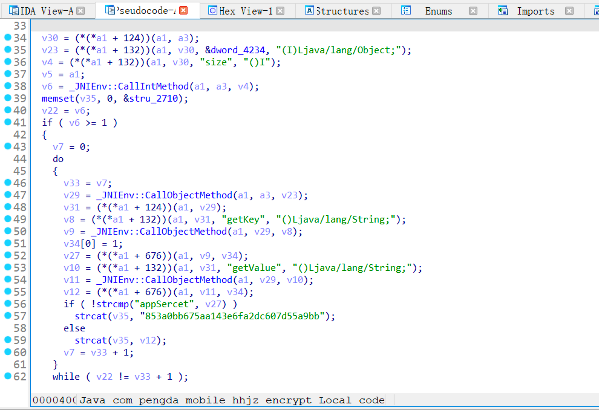 从左侧的函数列表里找到 Java_com_pengda_mobile_hhjz_encrypt_Local_code,这就是我们 Local 类的 code 方法。祭出我唯一会的 F5 大法!