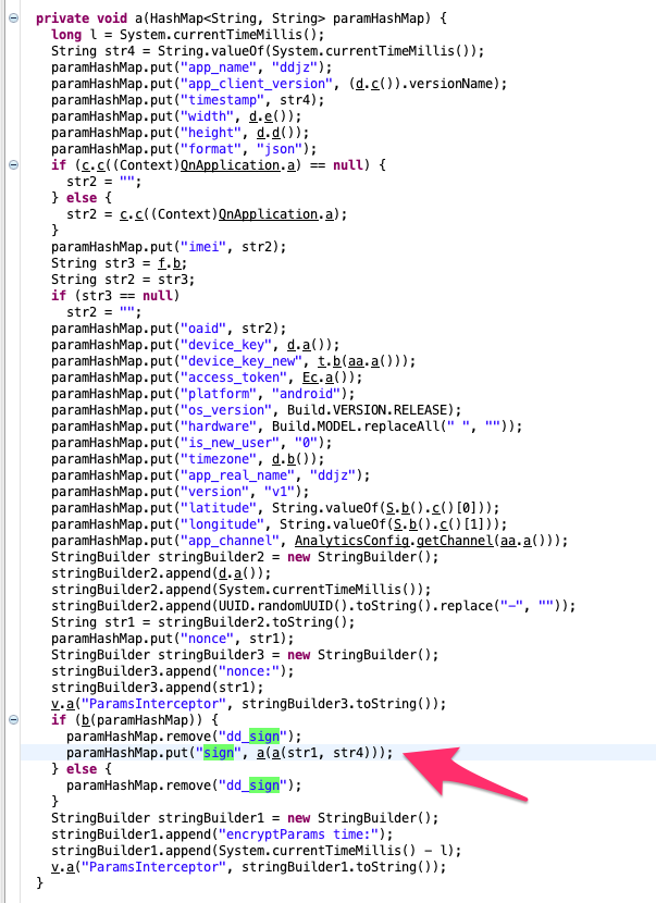 事实上叨叨记账还引用了高德地图的 SDK,所以搜索结果其实还是有干扰的。排除调形如 com.amap.* 的包名,在 classes3.dex 的 com.pengda.mobile.hhjz.b 下,找到了这些请求参数。