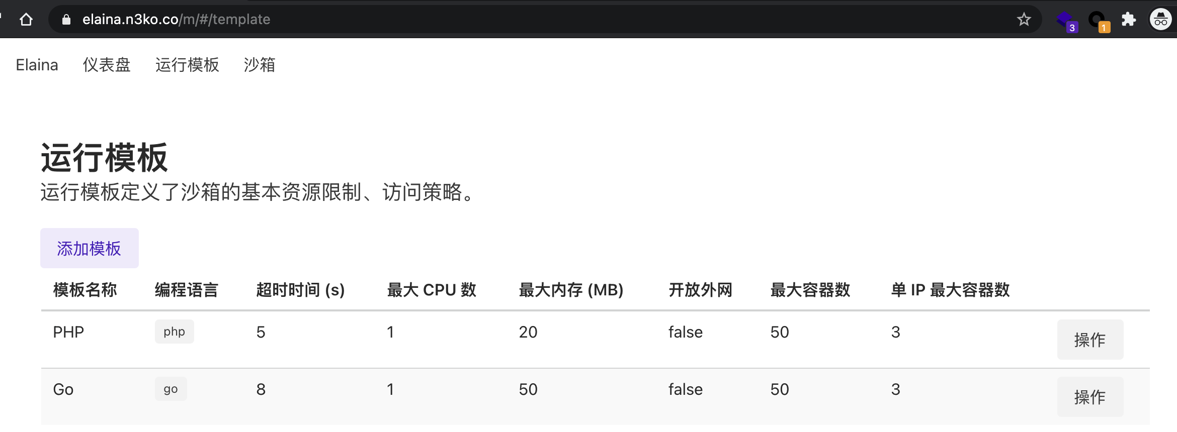 我给 Elaina 定义了“模板”与“沙箱”两个概念。“模板”规定了运行环境的编程语言、资源限制、超时时间等通用设置。“沙箱”则是基于单个模板创建的具体运行实例,可以设置其初始的代码。值得一提的是,Elaina 服务本身也是部署于 Docker 内的,因此在环境配置,特别是文件卷配置方面,较易搞混踩坑。