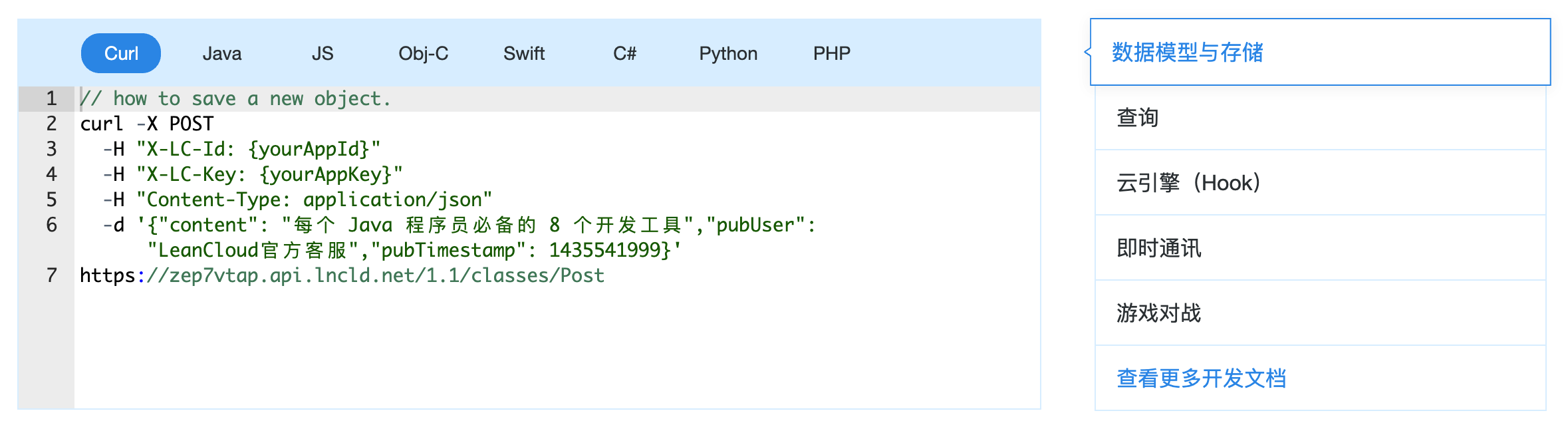 之前在 LeanCloud 的官网看到他们有一个使用各种语言调用 SDK 的示例代码。