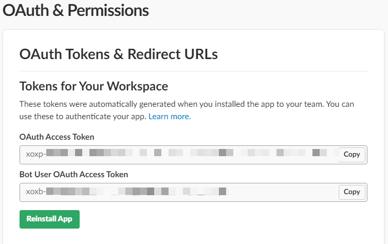 在 OAuth & Permissions 面板中记录下 Bot User OAuth Access Token。