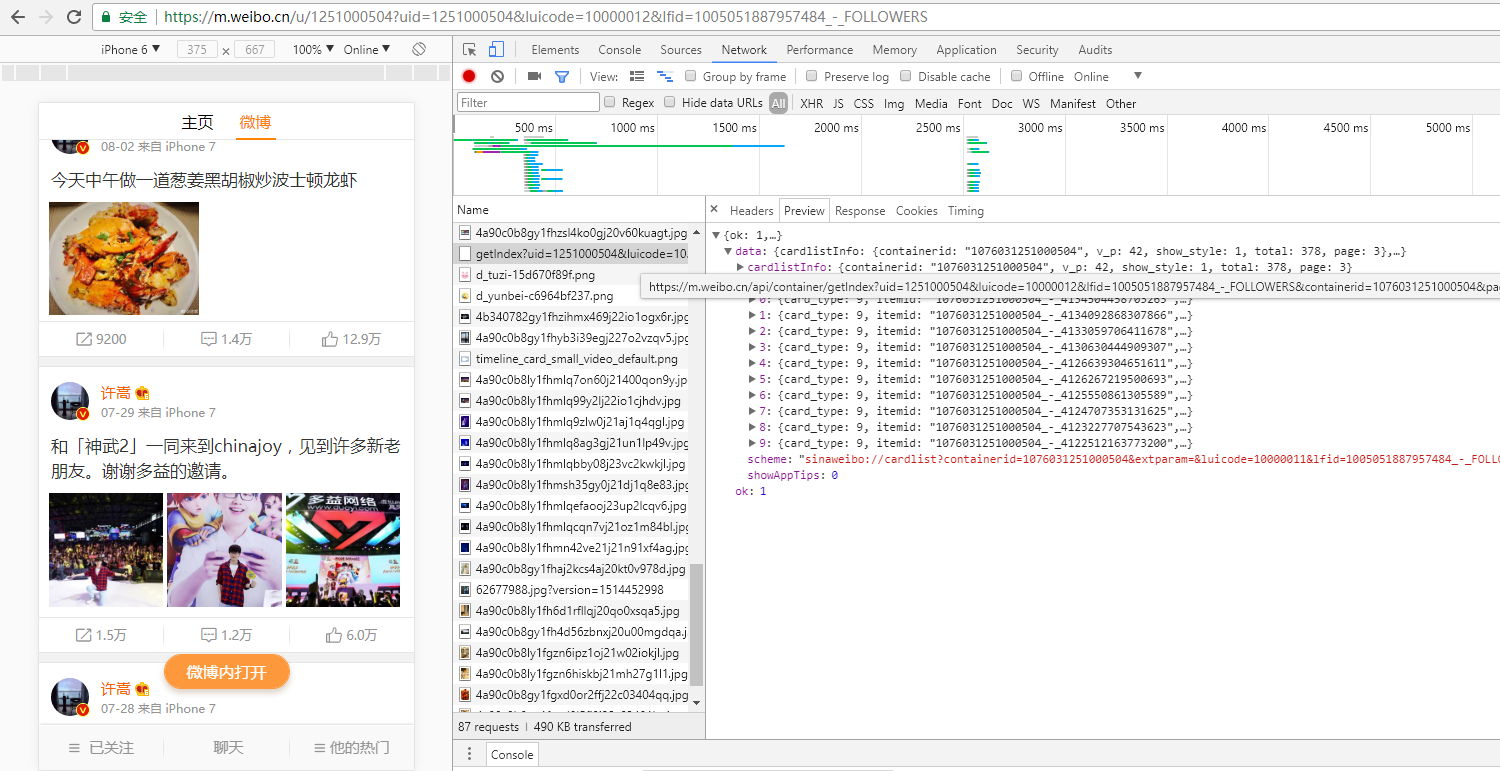 之前从各方面查询到的信息都显示抓取微博的数据十分麻烦,因为新浪有一个 Sina Visitor System,用于不定时地检测访问的来源是否正常。若是直接通过 URL 进入的访问,多半都会被要求登录。由此便衍生出了使用 Python 爬虫模拟登录等手段。因此我刚开始选择了走正道——申请新浪微博官方的开放 API 接口。向新浪提交了个人身份证认证开发者成功后,我发现新浪开放平台的 API 功能只是获取单一授权用户的所有关注用户的微博!完全没有用啊!白白把个人信息给了新浪!偶然的一次机会,我在B站上了解到可以从新浪微博手机版(https://m.weibo.cn/)上获取到 API 接口。顿时信心大增,打开 Google Chrome 的控制台直接轻松拿到了接口。